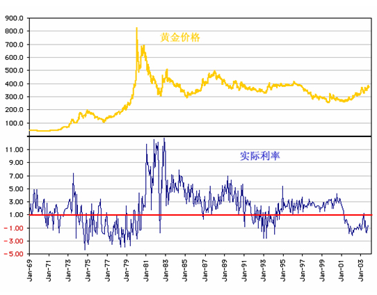 作為這個世界上唯一的非信用貨幣,黃金與紙幣,存款等貨幣形式不同,其自身具有非常高的價值,而不像其他貨幣只是價值的代表,而其本身的價值微乎其微。在極端情況下,貨幣會等同于紙,但黃金在任何時候都不會失去其作為貴金屬的價值。因此,可以說黃金可以作為價值永恒的代表。這一意義最明顯的體現即是黃金在通貨膨脹時代的投資價值——紙幣等會因通脹而貶值,而黃金確不會。以英國著名的裁縫街的西裝為例,數百年來的價格都是五、六盎司黃金的水準,這是黃金購買力歷久不變的明證。而數百年前幾十英鎊可以買套西裝,但現在只能買只袖子了。因此,在貨幣流動性泛濫,通脹橫行的年代,黃金就會因其對抗通脹的特性而備受投資者青睞。 對金價有重要影響的是扣除通脹后的實際利率水平,扣除通貨膨脹后的實際利率是持有黃金的機會成本,實際利率為負的時期,人們更愿意持有黃金。 例子: 實際利率=名義利率-通貨膨脹率。假設通貨膨脹率=4%, 銀行名義存款利率=3%, 實際利率=-1%, 100元存款一年后本息共計104元。104元 < 一年前100元。下圖為1969年-2003年間,黃金價格與實際利率在的對比圖,從圖中我們可以看出,在整個1970年代,實際利率絕大部分時間低于1%(圖中紅橫線),同期金價走出了一個大爆發的牛市。而在1980年代和1990年代,大部分時間實際利率在1%以上,這期間金價則在連續20年的大熊市中艱難行進。另外在2001年-2003年間,實際利率又低于1%水平,而這幾年恰是金價大牛市的開端。