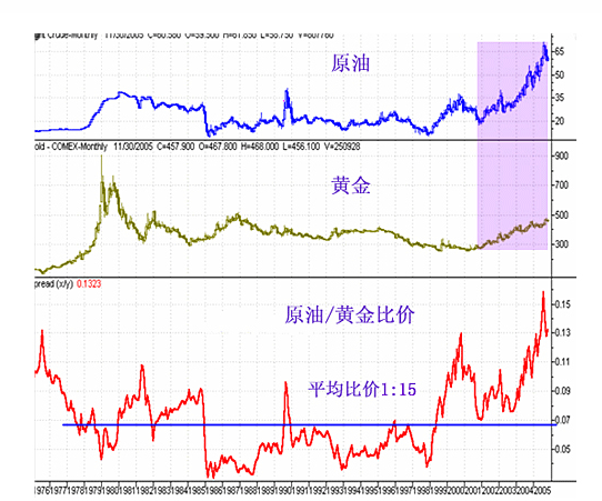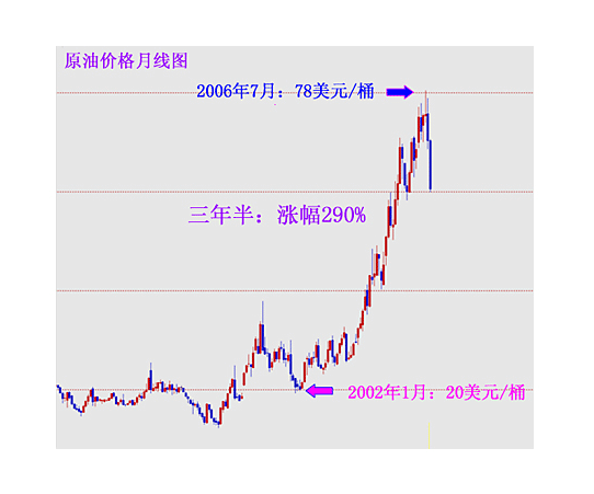 從上圖中可以看出,原油價格自2002年1月約20美元/桶,最高漲至2006年7月78美元左右。促使油價颮升的原因之一是世界經濟連續平穩快速增長,不論是美國還是以中國為的新興市場國家,經濟表現都非常良好,使得對原油的需求大增。而供給方面的因素則是世界原油產業脆弱的供需平衡,由于剩余產能有限,再加上地緣局勢動蕩,市場對原油供給可能中斷的擔憂一直未去,從而推升了油價至二十多年來高點。 雖然當前原油價格仍處在對前期上漲趨勢的修正之中,但供給與需求脆弱平衡的局面在較長一段時間內仍將持續,因此油價難以出現再深幅的下跌,高位運行且再起風云依然值得期待。 同樣的,國際大宗商品市場上其他商品價格的上漲,對于金價也有同樣的作用。金價始于2000年的這輪牛市,伴隨的是國際大宗商品市場,以原油,銅等為首的能源,金屬及部分農產品價格的大幅上漲。從1804-2004年世界商品價格走勢圖上來看,2000年左右恰是世界商品價格又一輪歷史性大牛市的開端。而在這兩百年間,總計已有5次超級別的牛市,最短的持續時間為15年,最長的則是40年。每一次大牛市都伴隨的戰爭和政治局勢的緊張:19世紀初是1812年的英法戰爭;19實際60年代是美國內戰;二十世紀的三次商品大市的重要促成因素分別是一站,二戰和冷戰。而當前,美國在全球范圍內的“反恐戰爭”,已在阿富汗,伊拉克打響了,這意味著世界局勢的緊張與動蕩局面將長時期的持續下去。