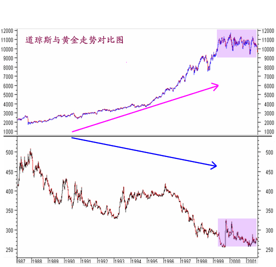 (2)股市與商品市場:美國股市與商品價格已多次演繹“蹺蹺板”的關系,20世紀已經發生了三個商品大牛市(1906-1923年、1933-1953年、1968-1982年),平均每個牛市持續17年多一點。在這個三個商品大牛市期間,對應的情況是美國股市的長期熊市和通貨膨脹的長期上升。 目前這輪以原油、金屬和部分農產品為代表的全球性商品大牛市起自2000年左右,至今已經持續了6年多。美國股市由于高科技泡沫破滅,自2000年最后一次創出歷史新高后開始處于調整下跌過程中,特別是納斯達克指數,目前僅為歷史高點的1/2。 作為股票的替代投資手段,黃金價格與美國股市也曾較高的負相關關系,下圖為道瓊斯指數與金價的在1987-2001年間的對比圖,在美國的股票市場的歷史性大牛市十,金價正走在長達20年的漫漫熊途之上。