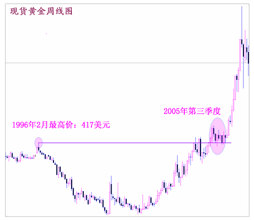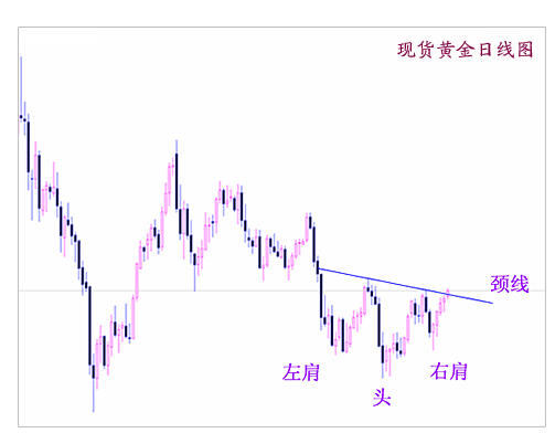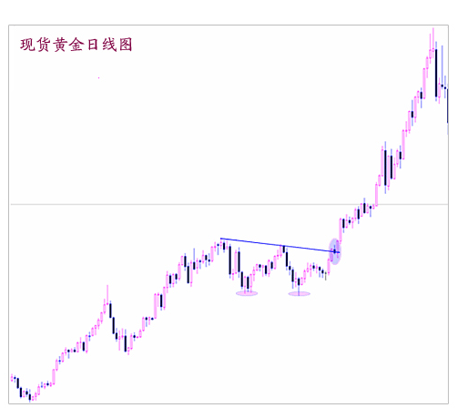 1、K線理論簡介: K線又稱陰陽線、棒線、紅黑線或蠟燭線,最早起源于日本德川幕府時代的米市交易,經過二百多年的演進,現已廣泛應用于證券市場的技術分析中,成為技術分析中的最基本的方法之一,從而形成了現在具有完整形式和分析理論的一種技術分析方法。 K線根據計算單位的不同,一般分為:日K線、周K線、月K線與分鐘K線。它的形成取決于每一計算單位中的四個數據,即:開盤價、最高價、最低價、收盤價。當開盤價低于收盤價時,K線為陽線(一般用紅色表示);當開盤價高于收盤價時,K線為陰線;當開盤價等于收盤價時,K線稱為十字星。當K線為陽線時,最高價與收盤價之間的細線部分稱為上影線,最低價與開盤價之間的細線部分稱為下影線,開盤價與收盤價之間的柱狀稱為實體。 由于K線的畫法包括了四個最基本的數據,所以我們可以從K線的型態可判斷出交易時間內的多、空情況。當開盤價等于最低價,收盤價等于最高價時,K線稱為光頭光腳的大陽線,表示漲勢強烈;當開盤價等于最高價,收盤價等于最低價時,K線稱為大陰線,表示匯價大跌;當開盤價等于收盤價時,且上影線與下影線相當時,K線稱為大十字星,表示多空激烈交戰,勢均力敵,后市往往會有所變化,當十字星出現在K線圖的相對高位時,該十字星稱為暮星;當十字星出現在K線圖的相對低位時,該十字星稱為晨星。綜合K線型態,其代表多空力量有大小之差別,以十字星為均衡點,陽線為多方占優勢,大陽線為多方力量最強,陰線為空方占優勢,大陰線為空方力量最強。應該注意的是,投資者在看K線時,單個K線的意義不大,而應與以前的K線作比較才有意義。 反轉型態(中長期型態): 單個K線可反映出單日的價格強弱變化,但它不能準確地反映出價格在一段時間內的變化趨勢。那么,對于一段時間的價格變化,我們不再利用K線的陰、陽、上、下影線進行判斷,而利用K線連接后所形成的中長期型態再加以判斷。K線的中長期基本型態有:頭肩型(頭肩頂、頭肩底);雙重頂(M頭);雙重底(W底),圓弧底(頂)形態等。 ①頭肩型K線在經過一段時日聚集后,在某一價位區域內,會出現三個頂點或底點,但其中第二個頂點或底點較其它兩個頂點或底點更高或更低的型態,這種型態稱為頭肩型。其中一頂二肩的為頭肩頂;一底二肩的為頭肩底型。然而,有時也可能出現三個以上的頂點或底點,若出現一個或二個頭部(或底部),兩個左肩與右肩,稱為復合型頭肩頂(或復合型頭肩底)。 點評:由于黃金市場規模較小,波動性大,不管是在長周期(月,周),還是短周期(日線圖)出現頭肩型形態的機率都比較小,而構建形態所需要的時間也不需要太長,往往一到兩個月的時間即可。如下圖所示金價在2006年9月中旬到10月底,在不到兩個月的時間構建了一頭肩底反轉形態,從而扭轉了自5月730高點以來的中期下跌趨勢。