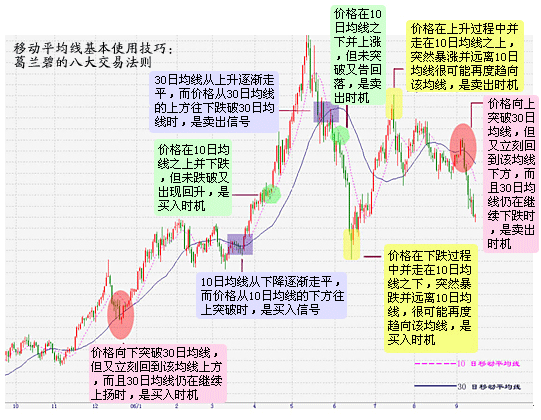 4、移動平均線-MA (Moving Average)在技術分析領域中,移動平均線是必不可少的指標工具。移動平均線利用統計學上的“移動平均”原理,將每天的市場價格進行移動平均計算,求出一個趨勢值,用來作為價格走勢的研判工具。 計算公式: MA = (C1+C2+C3+C4+C5+....+Cn)/n C 為收盤價,n 為移動平均周期數例如,現貨黃金的 5 日移動平均價格計算方法為: MA 5 = (前四天收盤價+前三天收盤價+前天收盤價+昨天收盤價+今天收盤價)/5 移動平均線依時間長短可分為三種,即短期移動平均線,中期移動平均線,長期移動平均線。短期移動平均線一般以5日或10日為計算期間,中期移動平均線大多以30日、60日為計算期間;長期移動平均線大多以100天和200天為計算期間。 移動平均線的基本應用方法:葛蘭碧的八大法則(見圖 3-1): 1. MA 從下降逐漸走平,而價格從 MA 的下方突破 MA 時,是買進信號。 2. 價格雖然跌至 MA 下方,但 MA 在上揚,不久價格又回到 MA 上的時候為買進信號。 3. 價格走在 MA 之上并且下跌,但未跌破 MA,價格又上升時可以加碼買進。 4. 價格低于 MA 并突然暴跌,遠離 MA 之時,極可能再度趨向 MA,是買進時機。 5. MA 從上升逐漸走平,而價格從 MA 的上方往下跌破 MA 時,是賣出信號。 6. 價格向上突破 MA,但又立刻回到 MA 之下,而且 MA 仍在繼續下跌時,是賣出時機。 7. 價格在 MA 之下并上漲,但未突破 MA 又告回落,是賣出時機。 8. 價格在上升過程中并走在 MA 之上,突然暴漲并遠離 MA,很可能再度趨向 MA,是賣出時機。 圖 3-1:現貨黃金日線圖(2005年9月末至2006年9月17日)