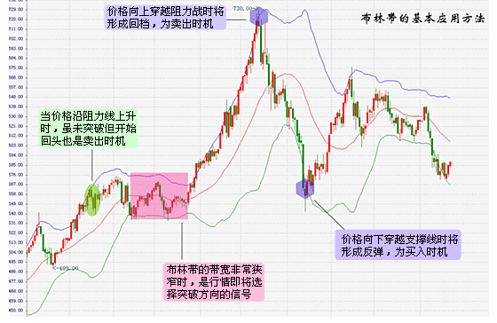 7、布林帶-BOLL (Bollinger Band) 布林帶由布林格 (Bollinger) 發明,也叫布林通道,是各種投資市場廣泛運用的路徑分析指標。一般價格的波動是在一定的區間內的,區間的寬度代表價格的變動幅度,越寬表示價格變動幅度越大,越窄表示價格變動幅度越小。布林帶由支撐線(LOWER)、阻力線(UPER) 和中線(MID) 三者組成,當價格突破阻力線(或支撐線)時,表示賣出(或買入)時機。在布林格發明布林帶之前,類似的路徑分析指標已經在金融市場中使用了,但后來布林格將這種方法加以改進并系統化。布林格本人最重要的貢獻可以說并不是其發明的布林帶指標,而是他在使用布林帶指標時著重強調的相對高低概念,并在分析時貫徹了這一思想。雖然此前已經有一些投資者意識到高低的位置都是相對的,但很少有人篤信并認真實踐這一思想。 計算公式: MID = 收盤價的 n 個周期簡單移動平均值 TMP2 = 收盤價在 m 個周期內的標準差 UPER = MID + P×TMP2 LOWER = MID - P×TMP2 (注:P為變量) 標準差的含義和計算公式在所有統計學教材和注冊會計師的《財務管理》教材中都有論述,有興趣的投資者可以查閱。 布林帶的基本應用方法(見圖 3-4): 1. 價格向上穿越阻力線時將形成回檔,為賣出時機。 2. 價格向下穿越支撐線時將形成反彈,為買入時機。 3. 當價格沿阻力線上升時,雖未突破但開始回頭也是賣出時機。 4. 當價格沿支撐線下降時,雖未突破但開始回頭也是買入時機。 5. 布林帶的帶寬非常狹窄時,是行情即將選擇突破方向的信號。在使用這一方法時務必謹慎,因為這時價格往往會出現假突破,投資者要等突破方向明確,布林帶的帶寬放大時再介入。 圖 3-4:現貨黃金日線圖(2005年12月初至2006年9月22日)