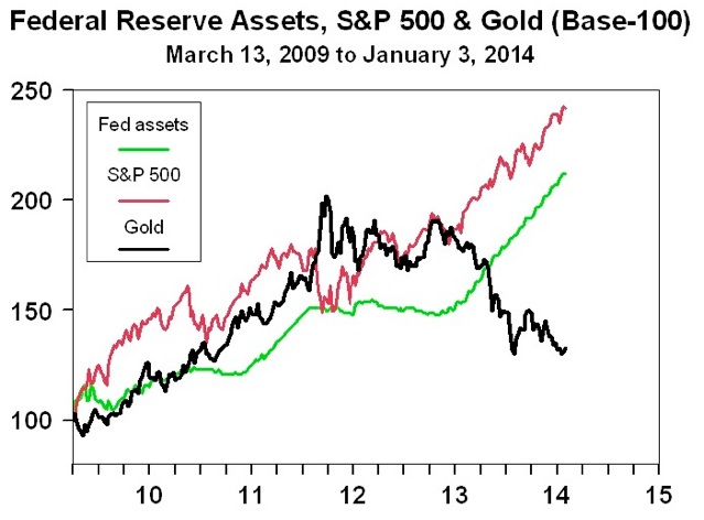 GoldMoney的創(chuàng)始人和CEO,著名黃金分析師 James Turk近日從一張圖表中給出了未來12個月金價會翻番的結論。  綠色:為美聯(lián)儲資產(chǎn) 紅色:標普500指數(shù) 黑色:金價 Turk認為,從這張圖表中可以看出在西方國家開始干預并且大幅操控黃金市場前,金價和標普500指數(shù)追隨美聯(lián)儲的資產(chǎn)負債表已經(jīng)有很多年了。并且很明顯的是,他們對金價的操控是不能持續(xù)的,但短期來看仍然影響巨大。 2009年三月美聯(lián)儲宣布增加1萬億美元購買資產(chǎn),標普500指數(shù)從當時的低點開始持續(xù)上漲。 在這樣的資產(chǎn)購買下,美聯(lián)儲將債務轉化成了美元,也就是所謂的“債務貨幣化”。Turk認為,事實上美聯(lián)儲除了印鈔什么也沒做。而印鈔意味著美聯(lián)儲在擴大自己的資產(chǎn)負債表。最終貨幣寬松的結果就是美聯(lián)儲的資產(chǎn)從2008年9月的8800億美元漲到了2011年7月的2.86萬億美元。隨后美聯(lián)儲有所停止,因此在2013年1月這個數(shù)字下降到2.81萬億美元。 Turk稱,正是讓他思索,為什么美聯(lián)儲會暫停擴大自己的資產(chǎn)負債表呢?將債券轉化成美元正是美聯(lián)儲做的,尤其是當銀行處在困難中,或者經(jīng)濟沒有如預期的發(fā)展時。 然而,美聯(lián)儲的從2009年3月到2011年7月所做的并沒有對美國經(jīng)濟產(chǎn)生什么太大的影響。失業(yè)率仍然很高,個人收入和零售數(shù)字則停滯不前,等等。 不過股票市場和黃金卻受影響大漲,兩者價格都在2011年達到創(chuàng)紀錄的高度。但同樣,兩者在此后的2012年都沒有再升高,因為美聯(lián)儲停止了擴大它的資產(chǎn)負債表。 Turk認為,這綜合起來看就是股市沒有因為經(jīng)濟好轉而從雷曼倒閉后的低點中回升,美聯(lián)儲投入的資金最終都進了股市。而黃金在貨幣寬松的環(huán)境中則凸顯出避險保值功能,價格大漲。 Turk稱他本預計美聯(lián)儲會繼續(xù)擴大資產(chǎn)負債表也就意味著金價會在2013年上漲,然而最終發(fā)生的卻是金價和美聯(lián)儲資產(chǎn)負債表總量的相關性被打破,但Turk認為這并不代表黃金的基本面發(fā)生了改變。 黃金的基本屬性在過去幾年都沒有發(fā)生變化,它5000年來就一直被用作錢,過去12個月也沒有對此發(fā)生重大改變。黃金仍然是錢,但政策制定者卻在想方設法將黃金從流通貨幣中剔除。 因此,今天大部分黃金都被儲藏著,Turk認為這些黃金都被作為存款放著。并且他認為沒有必要再去拯救國家貨幣,因為低利率意味著存錢利率無法抵消存錢的風險。 Turk認為金價在接下去的一年會有很大上漲,盡管美聯(lián)儲把每月購買債券的規(guī)模縮減成了750億美元,但它會繼續(xù)擴大自己的資產(chǎn)負債表,一年后總量會達到5萬億美元。而要把相關性恢復到常態(tài),金價要在未來12個月里翻番。